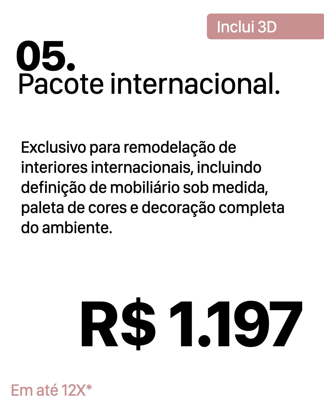 Formulado especialmente para te orientar nas principais escolhas de sua decoração, o pacote internacional 05 d interiores, contempla: